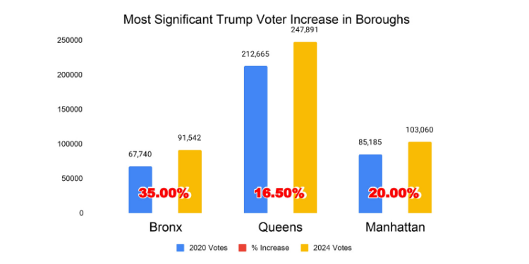In the 2024 presidential election, Donald Trump experienced a significant surge in support across all boroughs of New York City, marking a noticeable shift in voter preferences. While New York City remains a stronghold for Democrats, Trump’s increased performance in traditionally liberal areas signals a potential change in the city’s political landscape.